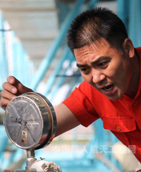 首先要进行加注连接器连接,然后将加注连接器连接到火箭加注口上。刘华兵在两位战友的协助下完成了对长征二F火箭四个助推器及三级储箱的加注连接器安装。然后再将加注软管与回转平台上的加注管道连接。这可是一个繁重的体力活。
